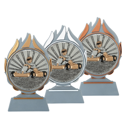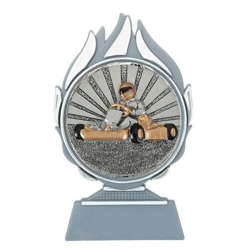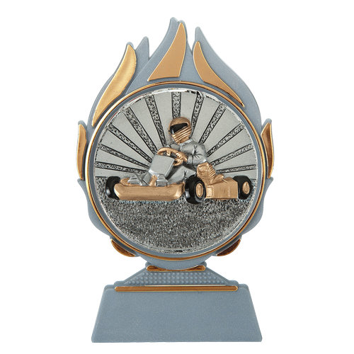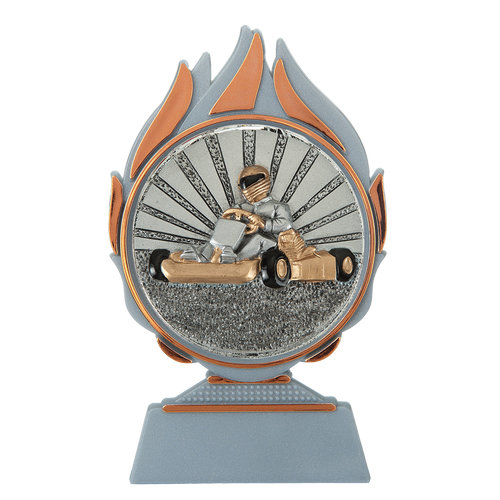 Het middelpunt van de Budget prijs karten is het ronde resin embleem met een diameter van 70 mm. Op het embleem is een karter afgebeeld in actie, wat direct verwijst naar snelheid, competitie en autosport.