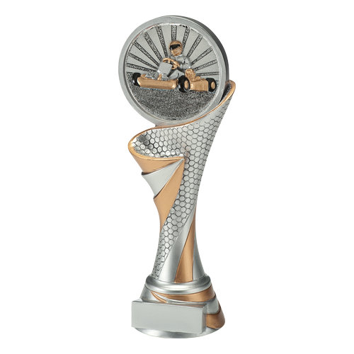 De vormgeving van deze kampioen prijs sluit aan bij het dynamische karakter van de sport. De opwaartse, licht gedraaide vorm straalt snelheid en vooruitgang uit. Bovenop bevindt zich een rond resin embleem met een duidelijke kartafbeelding, waardoor direct zichtbaar is dat deze prijs bij de kartsport hoort.